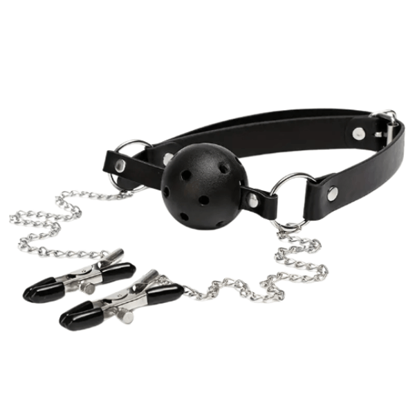 De toevoeging van tepelklemmen met kettingen maakt dit speeltje extra uitdagend. Terwijl de gag de mond bezighoudt, zorgen de klemmen voor prikkelende sensaties op de tepels.