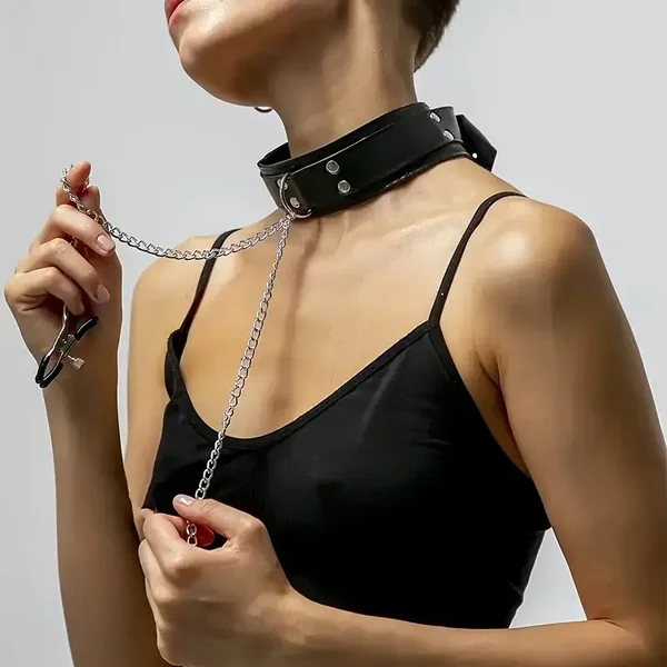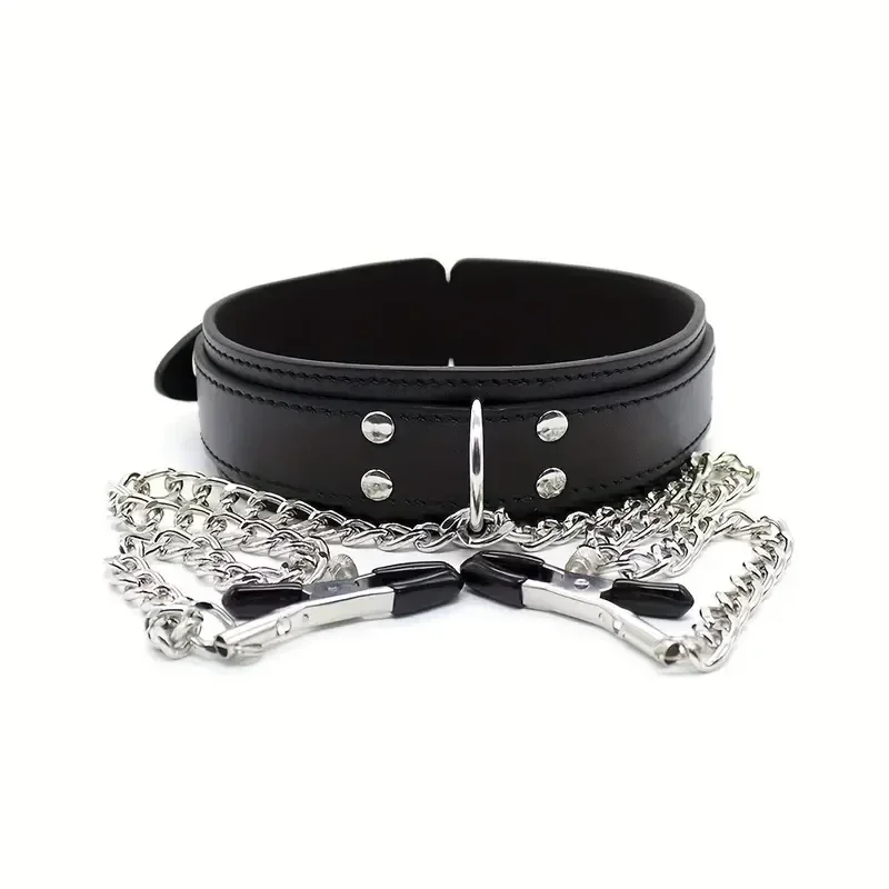 Deze halsband met tepelklemmen is perfect voor BDSM en bondage rollenspellen. Draag hem tijdens dominantie- en submissie spellen en ontdek hoe dit accessoire de spanning direct verhoogt. De visuele uitstraling alleen al zorgt voor een krachtige, sexy vibe.