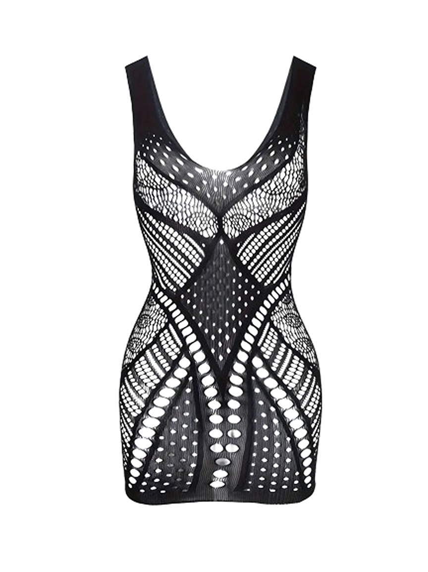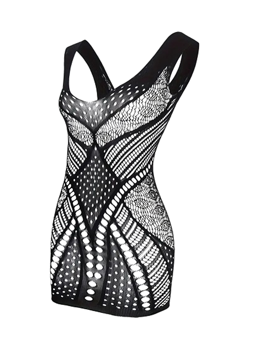 Zwart mini jurkje in lingerie stijl met brede schouderbandjes en speelse fishnet patronen. Een uitdagende combinatie van elegantie, erotiek en zelfvertrouwen.