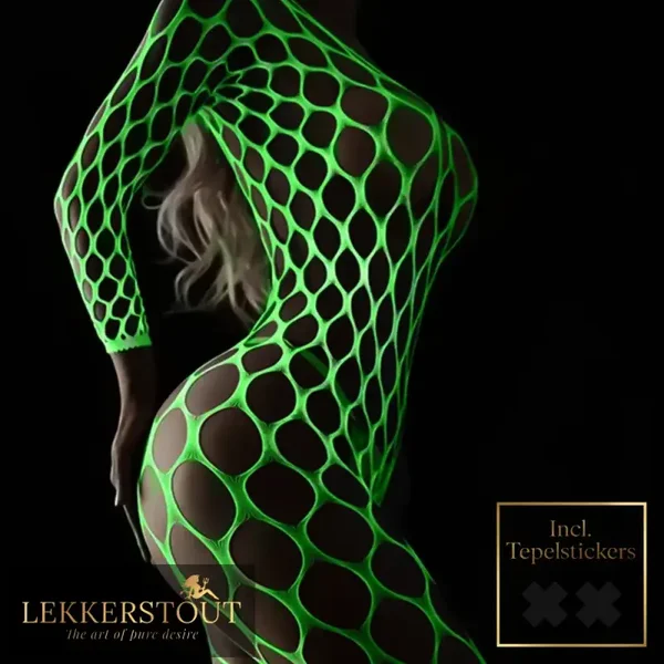 Deze glow in the dark visnet bodystocking is allesbehalve braaf. Overdag onschuldig, ’s nachts puur vuur. Ideaal voor vrouwen die durven spelen met licht, vorm en verleiding.