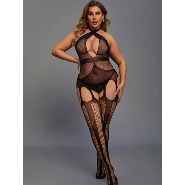 Sexy Plus Size Bodystocking met Jarretel & Kousen - Semi-Transparante Mesh