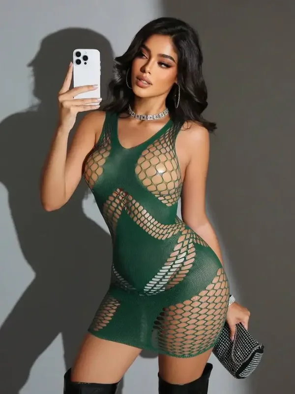 Ontdek de perfecte combinatie van elegantie en sensualiteit met deze doorschijnend groene visnet lingerie jurk die jouw natuurlijke schoonheid benadrukt en onweerstaanbare allure creëert.