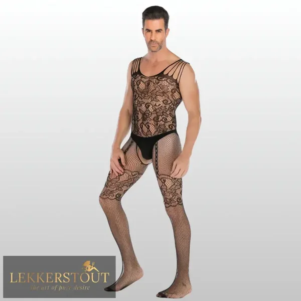 De combinatie van netstof, kant en subtiele openingen geeft deze mannen bodystocking een sensuele uitstraling zonder overdreven te zijn. De dunne bandjes over de schouders voegen een extra spannend detail toe. Aan de achterkant zorgt de open snit voor een ondeugende twist die perfect past bij het LekkerStout-gevoel.