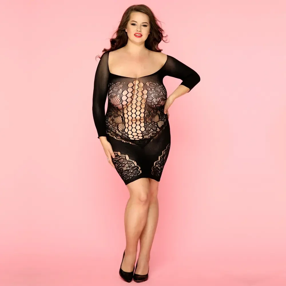 Deze sexy netjurk voor curvy dames is gemaakt van rekbaar en ademend materiaal dat zich soepel vormt naar je lichaam. De strategisch geplaatste openingen aan de voorkant creëren een speels en sensueel effect, terwijl het bloemenkant subtiel de huid laat doorschemeren. De ¾ mouwen en ronde halslijn geven de jurk een elegante uitstraling – perfect in balans tussen uitdagend en stijlvol.