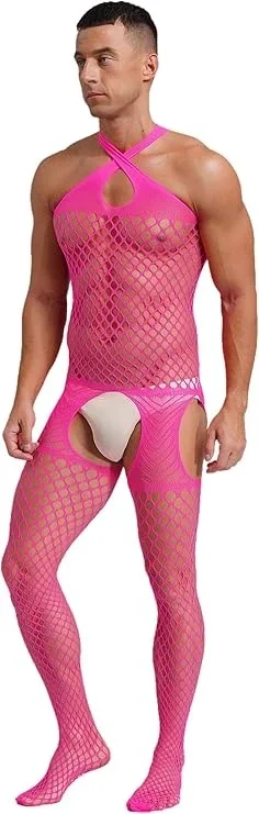 Heren Bodystocking Roze met Open Kruis en Gekruiste Halter